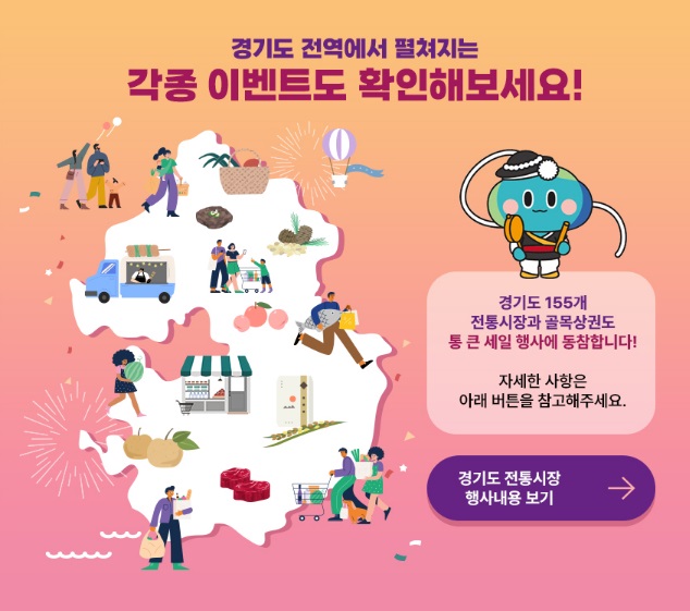 경기도시장상권진흥원은 물가 상승 등으로 경기 침체에 빠진 도내 전통시장의 활력 부여와 소비 촉진을 위해 경기도 및 시 ·군과 함께하는 '경기 살리기 통큰 세일'을 시작했다고 합니다.